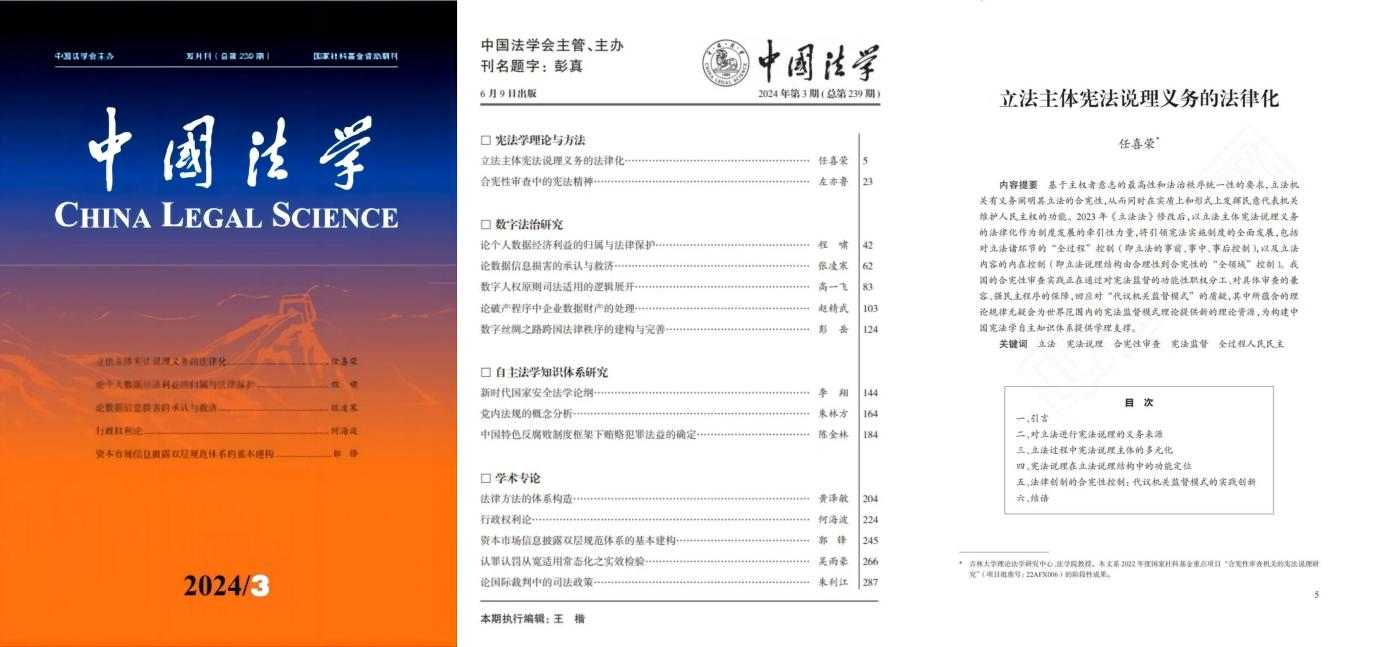 Professor REN Xirong from the School of Law at Jilin University (JLU) recently published an article titled Legalization of the Constitutional Reasoning Obligation of Legislative Bodies in the third issue of China Legal Science for 2024.