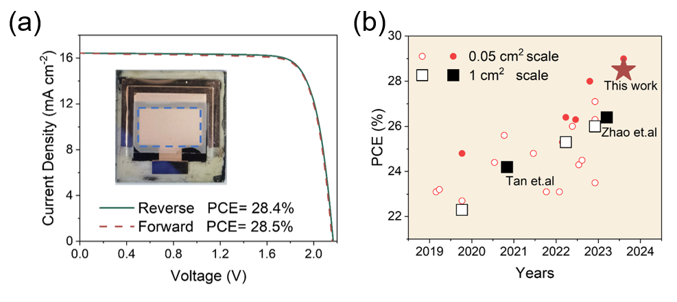 Experimental results showed that 1.05-square-centimeter all-perovskite tandem solar cells, based on this optimized design, achieved a record-certified power delivering efficiency of 28.2 percent. This efficiency represents a new world record for this device size and has been included in the Solar Cell Efficiency Tables.