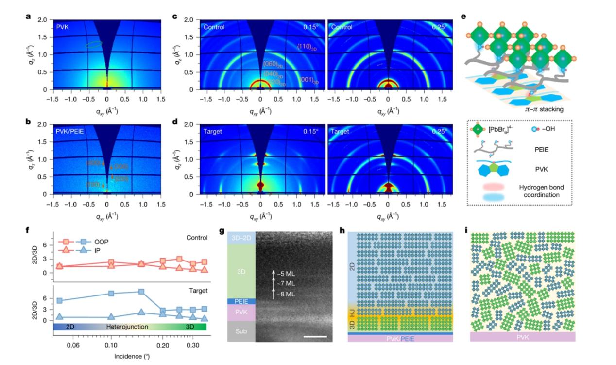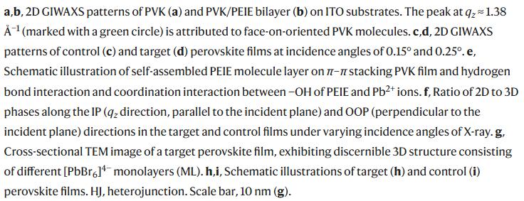 To overcome this challenge, the research team proposed a novel approach called “interface-induced crystallization”: introducing the hydroxyl-rich polymer PEIE onto the hole transport layer. This polymer can stably bond to the substrate via hydrogen bonds while coordinating with lead ions in the perovskite precursor through its hydroxyl groups, forming a high-density network of “molecular anchors”. This design enables bottom-up ordered growth: first inducing 3D perovskite to crystallize with horizontal orientation along the substrate, then spontaneously assembling a highly ordered 2D phase atop it, ultimately constructing a vertical gradient heterojunction with 3D perovskite below and 2D perovskite above.