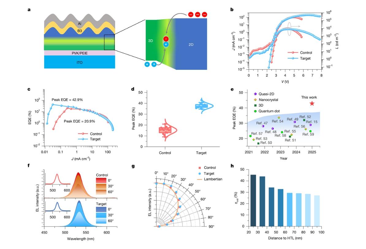 Recently, a research team led by Professors Ji Wenyu and Zhang Hanzhuang from the School of Physics at Jilin University, in partnership with Professor Xie Wenfa and Associate Professor Liu Shihao from the School of Electronic Science and Engineering, Professor Yang Yingguo from Fudan University, Professor Lu Haizhou from Southeast University, and Professor Tang Aiwei from Beijing Jiaotong University, reported major advances in improving luminescent interface and efficiency of perovskite light-emitting diodes (PeLEDs). The team reports a spontaneously formed 3D/2D vertically oriented perovskite heterojunction by means of a simple one-step spin-coating method. This structure effectively confines charge carriers and shifts the radiation zone away from the defect-rich surface region. The resulting PeLEDs achieved an EQE of 42.9% for the green emission (certified 42.3%), setting a new world record. The findings were published in Nature under the title “Maximizing perovskite electroluminescence with ordered 3D/2D heterojunction.”